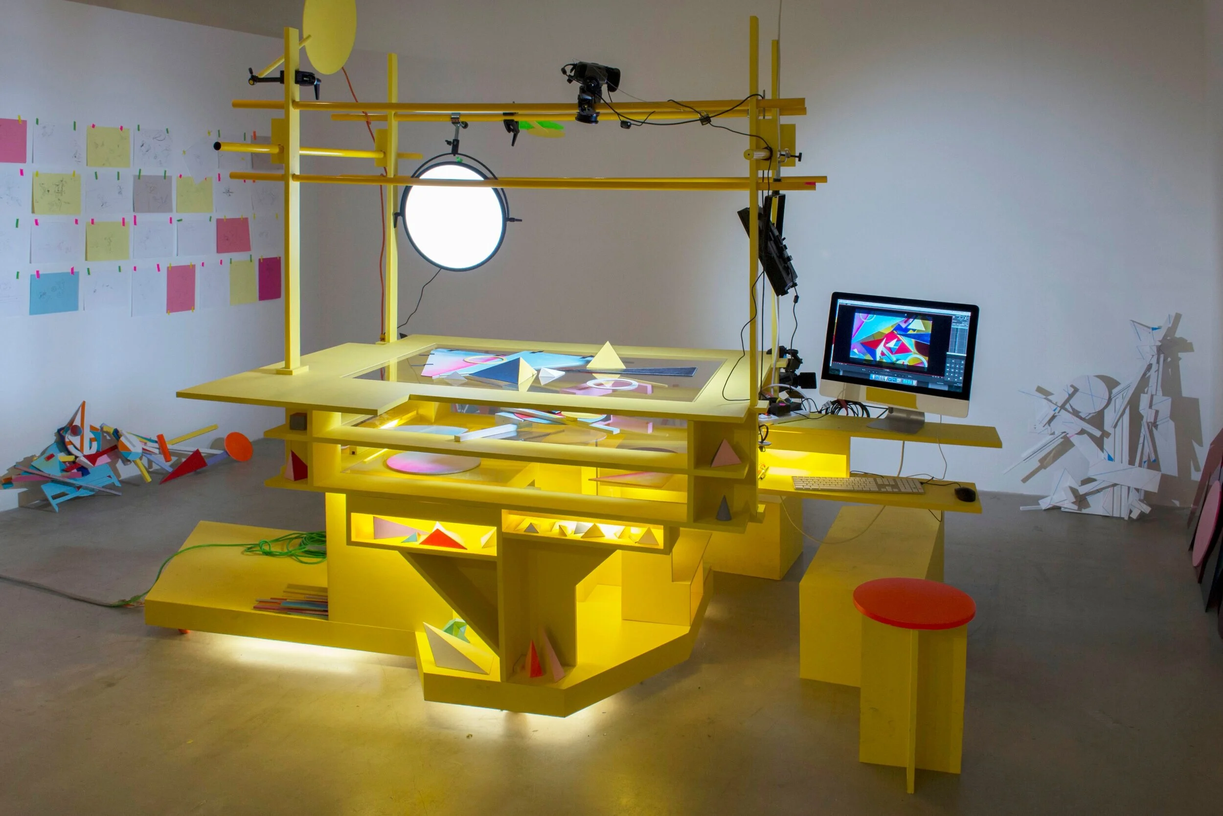 The project revolved around a multilevel sculptural device equipped with lighting and rigging for a digital camera and its onscreen controls. The unit was located at the SAIC Sullivan Galleries, in Chicago, for the duration of the Hélio Labs workshops, and teams of students and volunteers regularly collaborated with the artist choreographing and moving abstract shapes in tiny increments, each step being shot and then assembled as a stop motion animation movie. Animation components included cardbord, plexiglass, acetate, paper, wood shapes, as well as articulated sculptures built by Amy Yoes to supply machine like motions.
